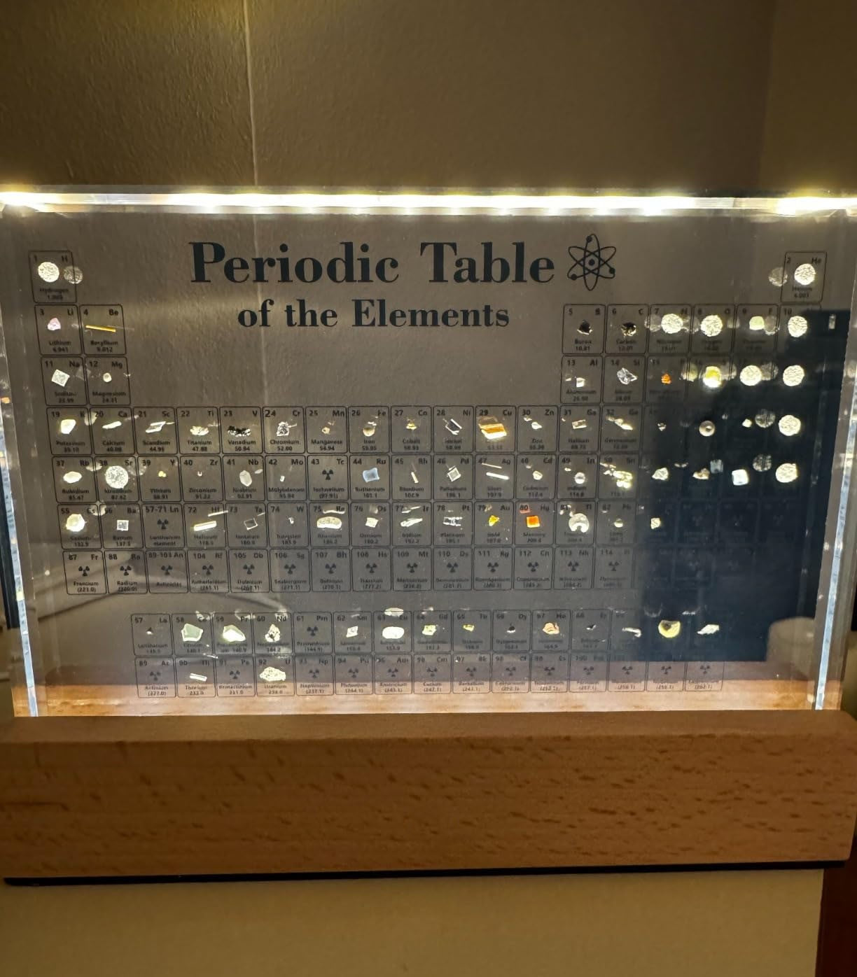 Yes, absolutely. All elements are encased in crystal-clear acrylic, so you can view them from different angles with ease. When the base lights up, the elements look even more vivid and eye-catching. If you wear glasses, you might need to be a little closer to read the tiny labels, but the display is designed to be clear and easy to enjoy.