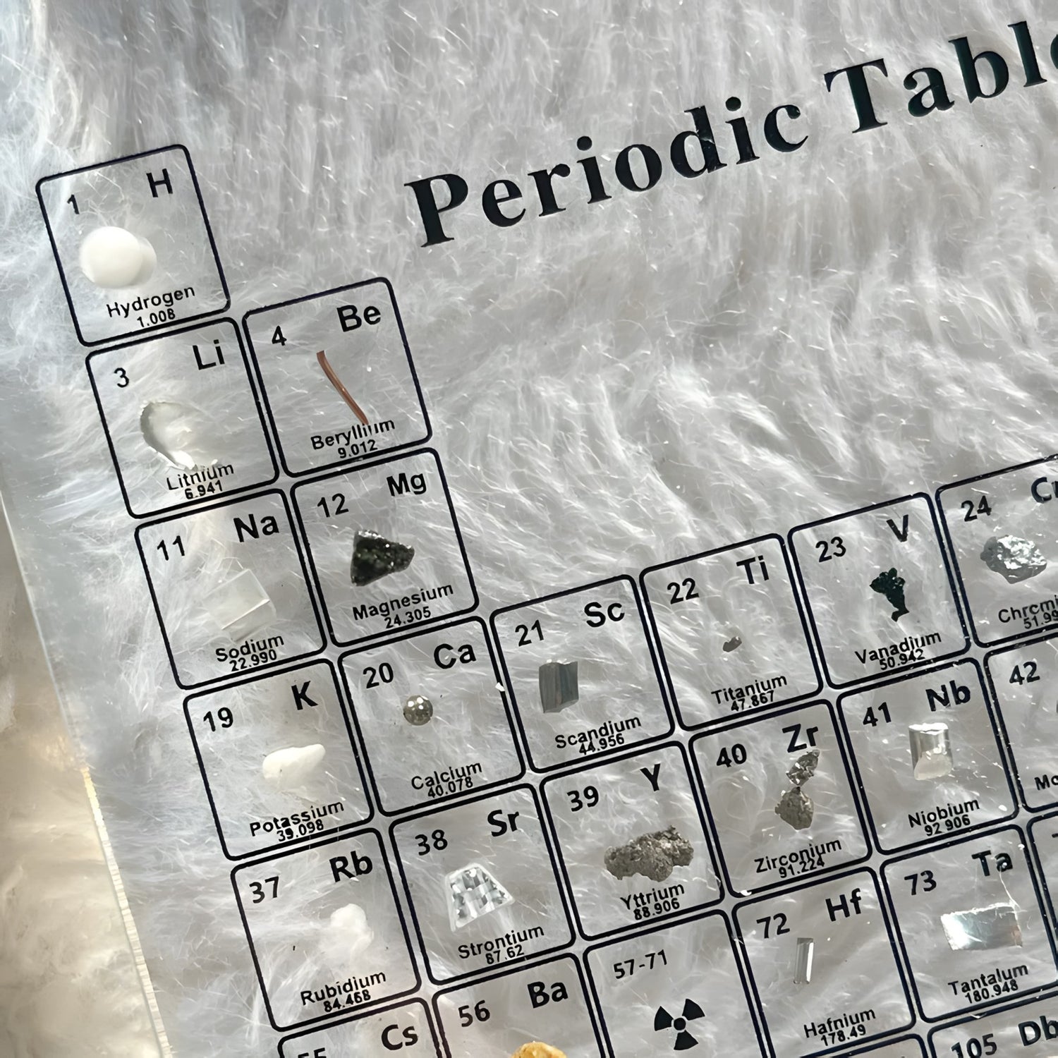 Yes! There are 76 real, solid element samples carefully sealed inside the acrylic. For the gaseous elements like Oxygen, Helium, and Neon, we use clearly labeled fillers to represent them, since the actual gases can’t be included. You’re still getting a true hands-on look at the real layout of the periodic table.
